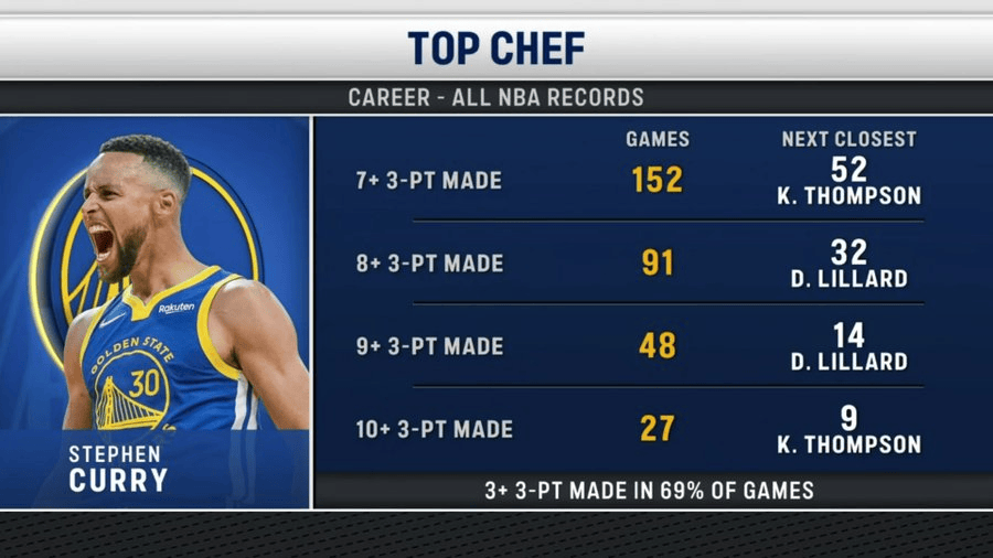 转播镜头打出一项数据:库里单场7、8、9、10记三分的场次均位列历史第一。